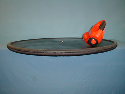 This device gives the opportunity for students/instructors to experience Newton’s Laws of Motion. The Hovercraft is a 1.2 meter diameter wood platform with an attached nylon skirt. A high volume battery powered air source provides the lift capabilities for the device to provide an almost frictionless ride for the participants.