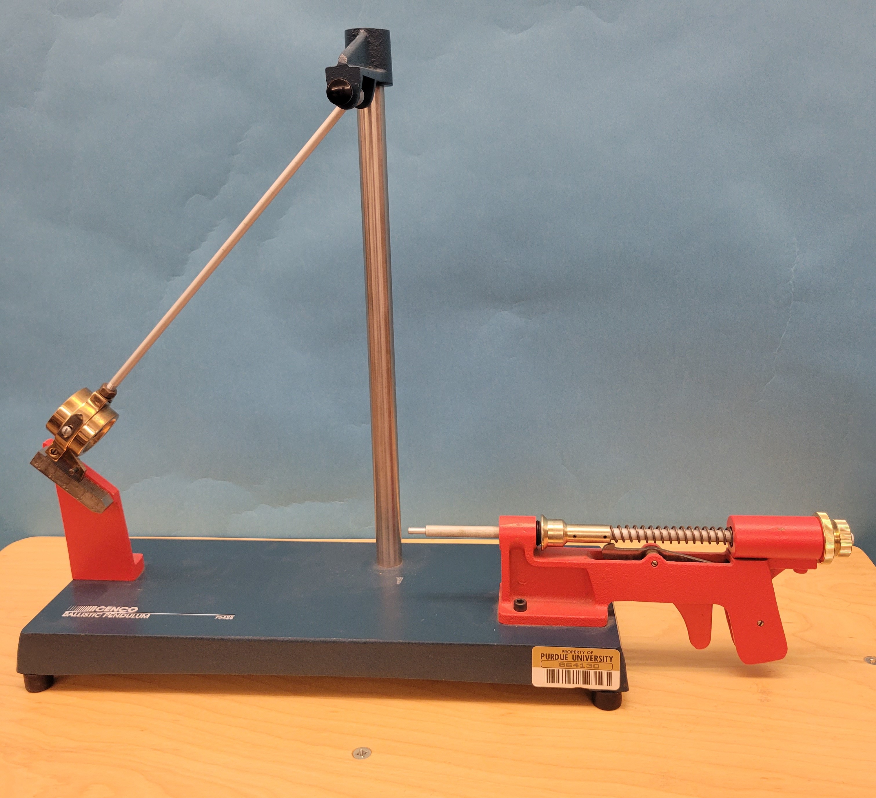 Directions: Remove the drilled brass ball from the pendulum arm. To do this, apply pressure to the ball through the narrow hole in the back of the hoop. The ball should pop out with sufficient force. (A pencil can also be used as a tool to aid in this process.) Attach the ball to the end of the spring-loaded arm and use it to compress the spring until the arm catches on the release mechanism. You can fire the ball by using the trigger and measure the approximate height of the swing using the scale attached on the opposite side of the device. The impulse given to the ball by the spring can be adjusted using the knob attached to the spring-loaded arm.