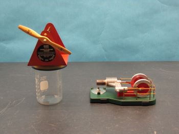 In demonstrating the Stirling Engine, engage the heat source and after a short amount of time give the flywheel or propeller a twist. The engine should then run unaided.