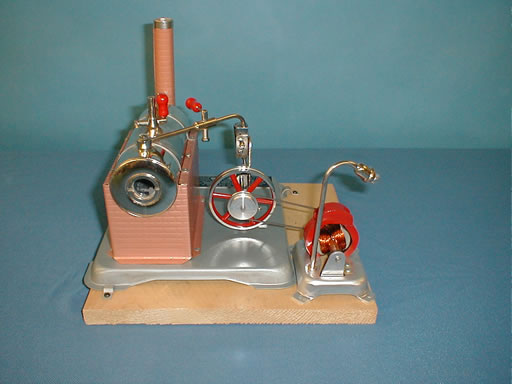 This demonstration uses a miniature steam engine to illuminate a light or blow a whistle. A steam engine works by using a fuel to heat water. The heated water will change to steam. The steam goes into a cylinder and does work on a piston. When the piston is fully extended, a valve opens in the cylinder allowing the steam to escape. By the inertia of the flywheel, the piston is pushed in the opposite direction diminishing the volume of the cylinder. Another valve opens allowing steam to enter and the process continues.