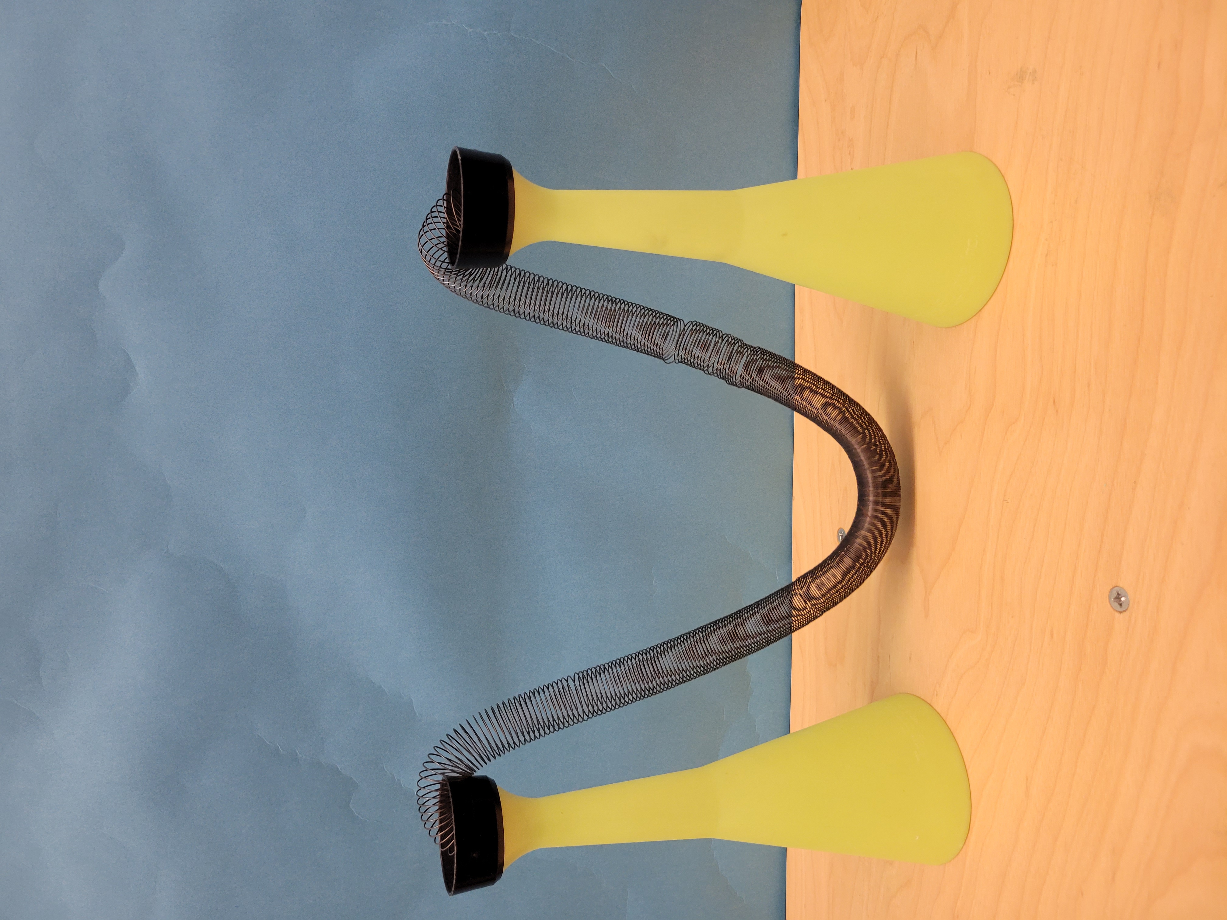 This demo shows how sound can be transferred through other media than air. Sound waves in one of the cones force the spring to vibrate transferring the sounds to the opposite cone, similar to a telephone made of cans and a string.