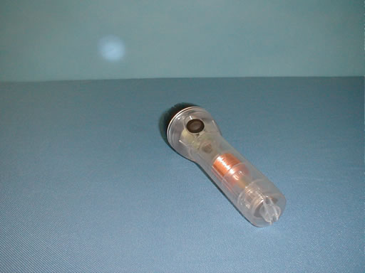 This is a flashlight without the usual power source, a dry cell. To operate the flashlight, shake it vigorously in an up and down motion for 30 seconds. This back and forth motion passes a strong magnet through an induction coil. The energy generated by the motion is stored in a capacitor. By engaging the switch, the capacitor will discharge through the light.