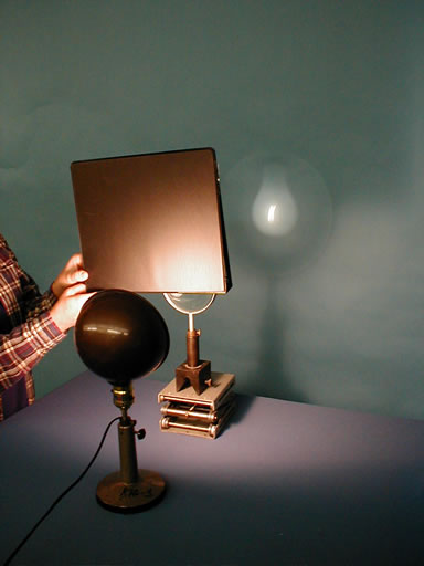 Directions: Dim the room lights and use a large diameter convex lens to project an image of a frosted light bulb on the screen. (Place a blocking device behind the bulb to prevent glare in the students eyes.) Once the image has been focused on the screen, slowly lower the card in front of the lens. The image will get dimmer, but remain complete until you have completely blocked the lens.