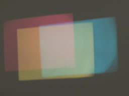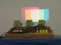 Directions: Three slide projectors are mounted side by side in a box. Dim the room lights, turn on each projector and adjust the focus so that three three sharp squares almost completely overlap on the screen. (By not having complete overlap, the individual colors can still be seen at the edges.)