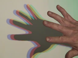 Directions: Use the apparatus for Demo 7C - 01. Dim the room lights. Turn on all three projectors to produce a white rectangle on the screen. Move an object (such as your hand or your entire body) from near the projectors toward the screen. Colored shadows will appear, the particular arrangement depending on how close you are to the screen and the order of the RGB lights. Experiment a bit with different placements.