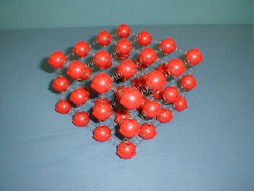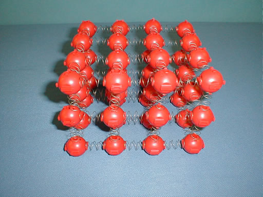 This is a visual demonstration of a simple solid crystal, a Primitive Cubic. The model is composed of brightly colored spheres representing atoms and springs representing their bonds. The model can be modified to exhibit other physical properties such as: longitudinal and transverse wave models; vibrations; torque and shear forces; pressure; wave speed and density.