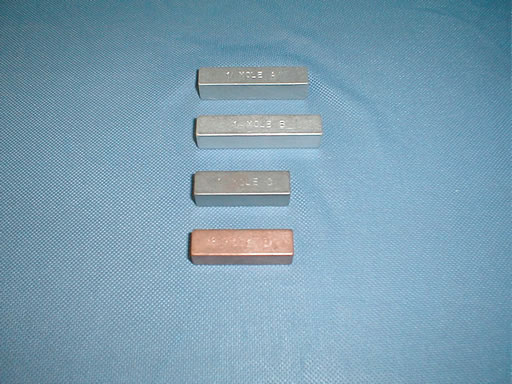 The Mole Set contains for specimens of copper, iron, zinc and aluminum. Each specimen contains 1 mole 6.02 x 1023 atoms. This gives students a good representation of what 1 mole is in the solid state.