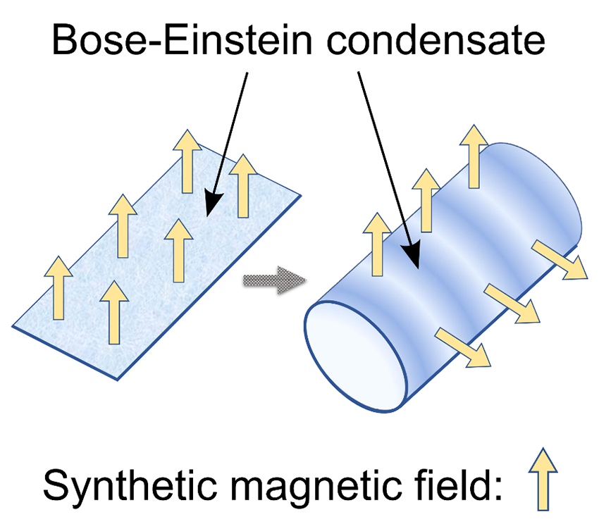On the left is a typical Hall strip. On the right is the Hall cylinder. The yellow arrows represent the direction of synthetic magnetic fields. A Bose-Einstein condensate on the Hall cylinder automatically develops intriguing topological features that are absent in the Hall strip.