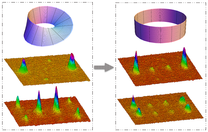 These magnetic fields result from a quantum mechanical phase carefully engineered by the team. They determined that, once they had experimentally fixed such a phase, an identical magnetic field effectively always perpendicular to the surfaces of the strip or cylinder (in the synthetic space) emerges even when the size changes or the shape slightly deforms.