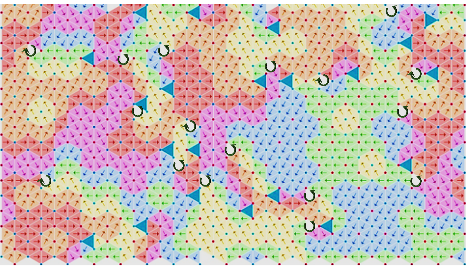 "We discovered that a particular mechanism called 'quantum coarsening' (coarsening is the same as the formation of an intricate network of magnetic domains - just like domains of "up" ↑ and "down"↓ spins in a ferromagnetic tape which helps us store and erase information) is observed when XY pseudospins derived from Ising spins are placed in a triangular motif. We capture features of the celebrated Kosterlitz-Thouless model close to its zero-temperature phase transition (named after Thouless, who won the Nobel in 2016 for the discovery of topological phase transitions)," says Banerjee. "This behavior is different from classical coarsening and percolation and overwhelms other slower mechanisms (such as the Kibble-Zurek mechanism where there forms a network of coherent excited states). We see a population of vortices and antivortices (topological defects) appearing on the D-Wave chip which obey a certain mathematical relationship ('scaling law') with how fast we 'quench' the system."