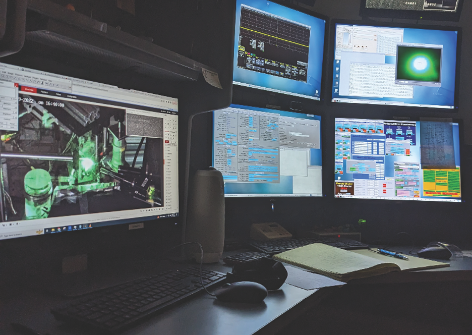 Running the time-resolved X-ray emission experiment at the BioCARS beamline at Advanced Photon Source after long spectrometer development and experiment preparation. Green laser light is visible as it advances the Photosystem II protein through the Kok cycle. Photo provided by Yulia Pushkar.