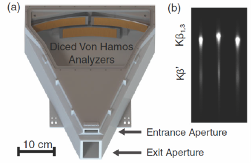 (a) The 3D‐printed spectrometer with three von Hamos analyzers inside. Analyzers are shown in orange for visibility. (b) The Pilatus 100 k image of the emission spectra from MnO showing the reflection of each of the three analyzers. S. Jensen, X-ray spectrometry, 2019.