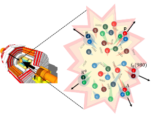 This picture illustrates the formation of particles in heavy ion collisions. Particles tend to form when the constituent quarks have similar positions and momenta. (Figure provided by Fuqiang Wang)